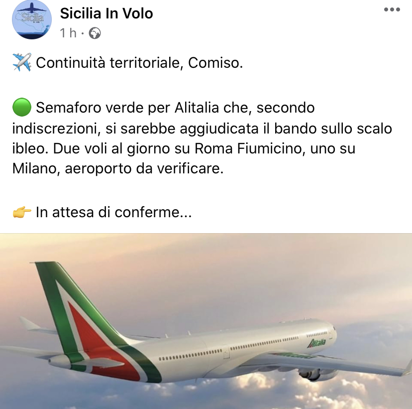 Iniziano a circolare indiscrezioni circa il fatto che #Alitalia si sia aggiudicata il bando per la continuità territoriale su #Roma e #Milano da #Comiso.
