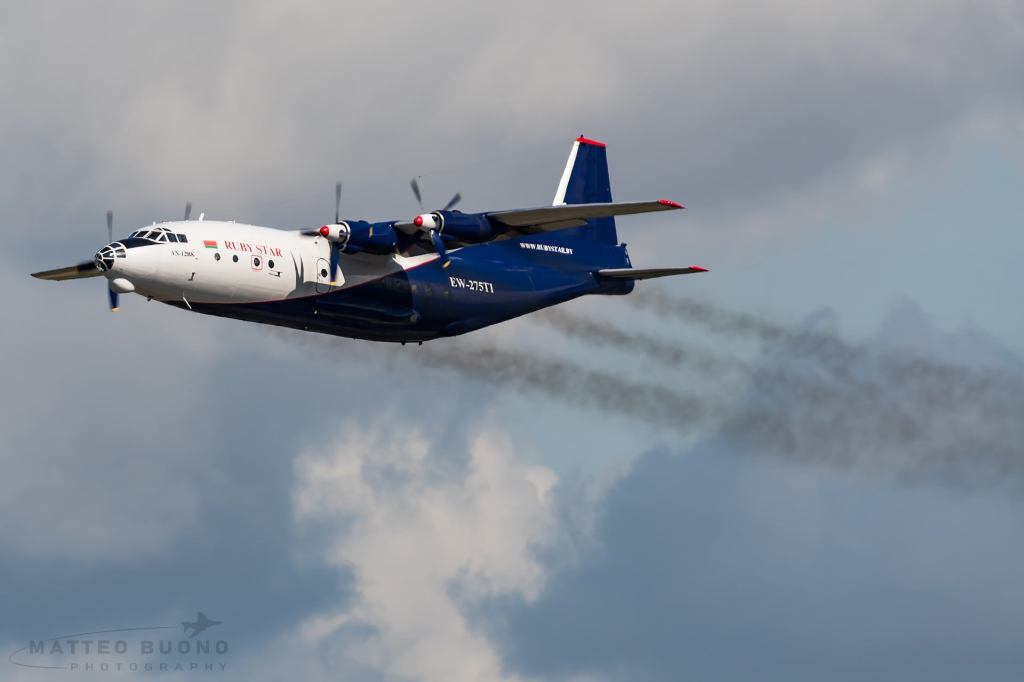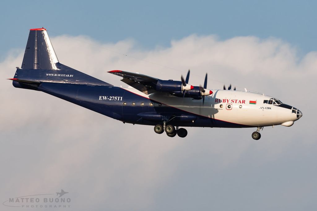 Bello e fumoso, un qualcosa che arriva da tanto lontano sull’aspetto temporale. E’ un aereo costruito cinquant’anni fa nel 1970, questo An12BK EW-275TI della Ruby Star. fino alla fine di settembre ha operato voli charter cargo tra Roma e Tangeri. Ha trasportato componenti per l’industria automobilistica dall’Italia verso il Marocco. La sua presenza non è passata inosservata a Matteo Buono e vi proponiamo le sue immagini.