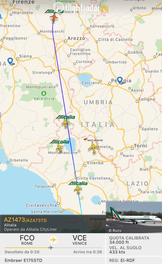 Oggi e’ martedì sera e siamo in pieno ambito di traffico business lavorativo, che però latita pesantemente, ciò portando Alitalia a utilizzare questi velivoli di bassa capienza.