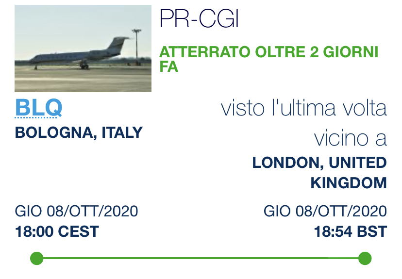 Da qualche tempo in Italia appare per brevi soste un Gulfstream G550 brasiliano. E’ da qualche settimana stanziato a #Londra #Luton, ha le marche PR-CGI, e’ di proprietà di Trop Comercio Exterior Ltda. Negli ultimi tempi ha toccato gli scali di #Milano #Linate e #Bologna. Nel primo e’ giunto direttamente da Rio de Janeiro Galeao il 5 settembre dopo 10 ore e 58 minuti.