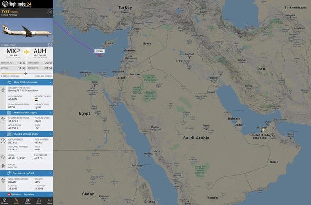 Da Flightradar24 possiamo documentare che il primo aereo a farlo e’ stato il volo da Milano Malpebsa a Abu Dhabi EY88.