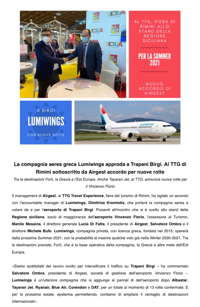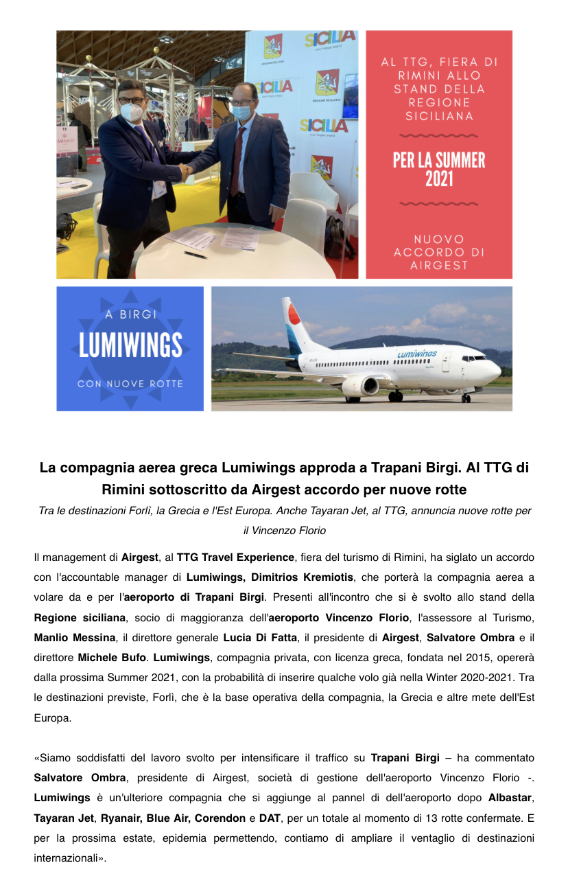 compagnie aeree Lumiwings apre nuove rotte da Trapani Pubblicato da Italiavola il 15 ottobre 2020 Nuove rotte da Trapani per Lumiwings. L’accordo siglato al TTG di Rimini. Ci sarà anche un collegamento per Forlì, base operativa del vettore. Le nuove rotte saranno operare dalla prossima estate 2021. Condividi: Fai clic per condividere su Facebook (Si apre in una nuova finestra) Facebook Fai clic qui per condividere su LinkedIn (Si apre in una nuova finestra) LinkedIn Fai clic qui per condividere su Reddit (Si apre in una nuova finestra) Reddit Fai clic qui per condividere su Pinterest (Si apre in una nuova finestra) Pinterest Fai clic qui per condividere su Tumblr (Si apre in una nuova finestra) Tumblr Fai clic per condividere su X (Si apre in una nuova finestra) X Mi piace Caricamento... Correlati