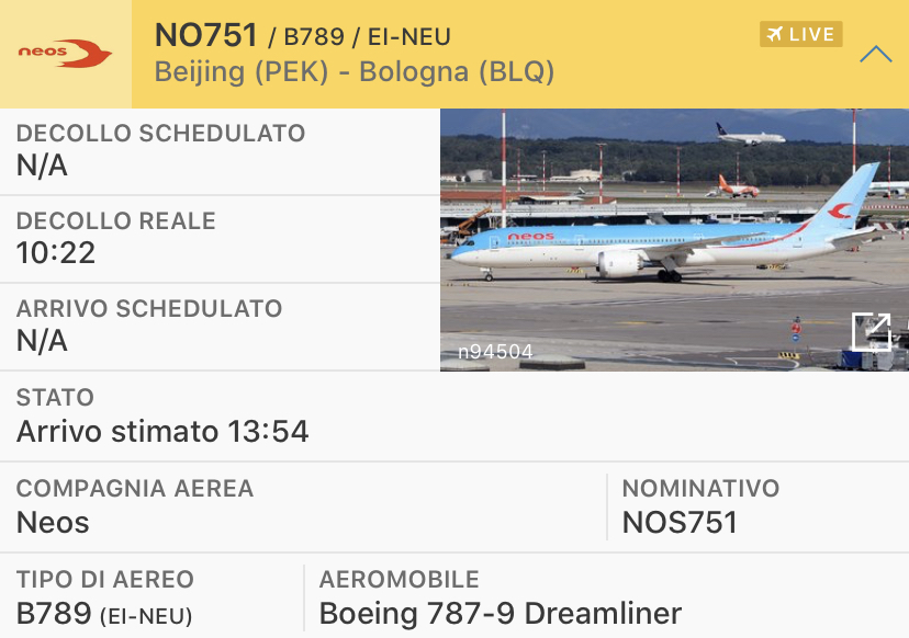 Il volo NO751 poco prima delle 14 arriverà a #Bologna proveniente da #Pechino con il Dreamliner EI-NEU che da giorni sta facendo la spola.