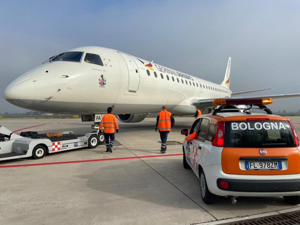 IL EMB190 della German Airways ha trasportato il team McLaren. A seguire un immagine del piazzale. Molti aerei, ci è stato segnalato, arrivavano e poi ripartivano con i clienti a bordo.