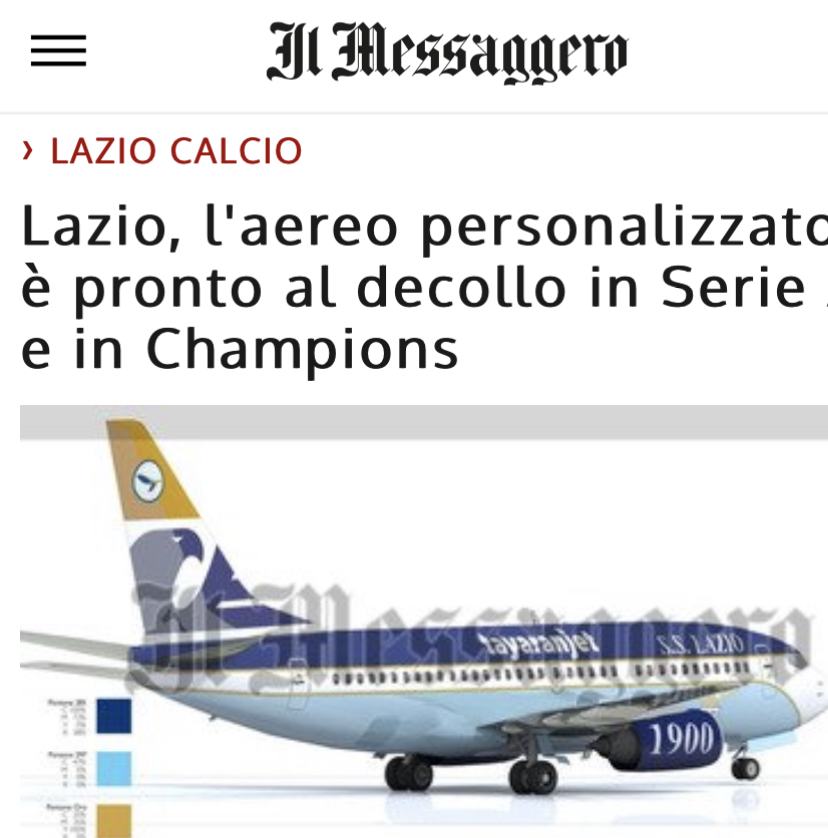 E’ pubblicato sulla versione online del quotidiano Il Messaggero il rendering della livrea dell’aereo con i colori sociali che la squadra di calcio SS Lazio si e’ fatta personalizzare da Tayaranjet. Il velivolo Boeing 737-330 LZ-TYR uscirà’ questa sera da un hangar di una Ditta specializzata a Shannon in Irlanda.