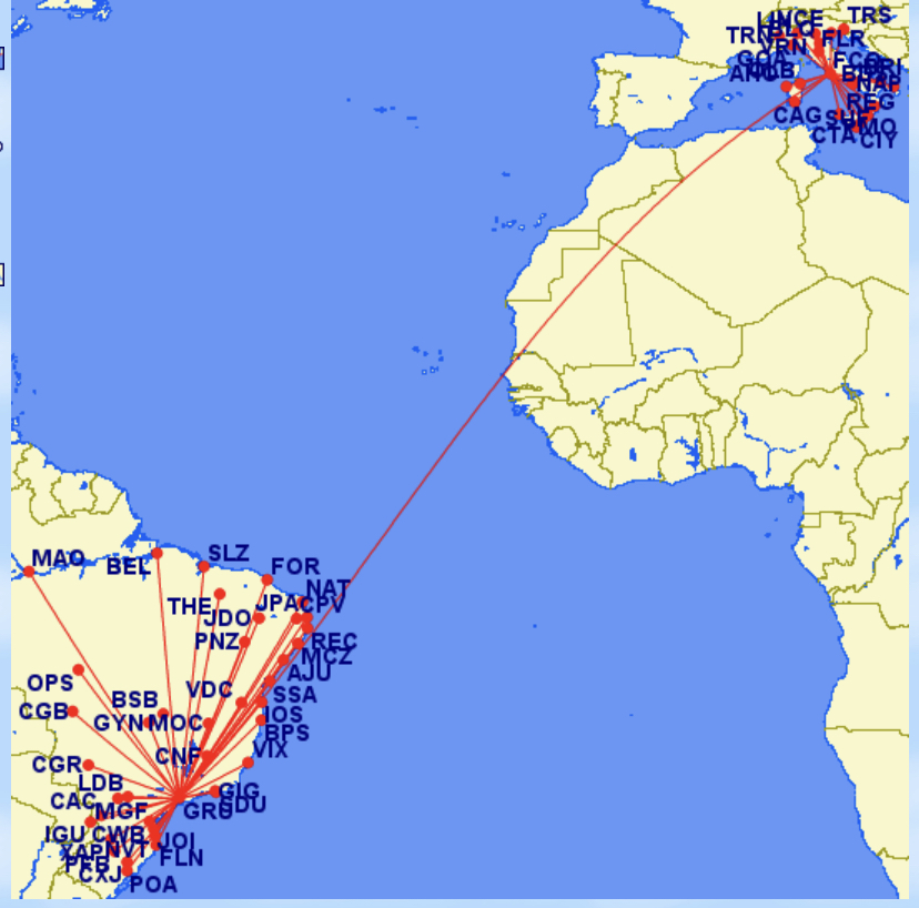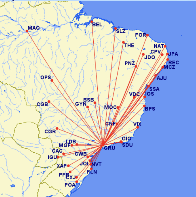 Aracaju (AJU), Caxias do Sul(CXJ), Belem(BEL), Porto Seguro(BPS), Brasilia(BSB), Cascavel (CAC), Londrina (LDB), Cuiaba( CGB), Campo Grande (CGR), Belo Horizonte(CNF), Campina(CPV), Curitiba(CWB), Florianopolis(FLN), Fortaleza(FOR), Rio de Janeiro (GIG), Goiana(GYN), Iguazù(IGU), Ilhéus (IOS), Juazeiro do Norte (JDO), Joinville (JOI), Joao Pessoa (JPA), Manaus(MAO) Maceio(MCZ) Maringà(MGF) Monte Claros (MOC) Natal(NAT), Navegantes(NVT),