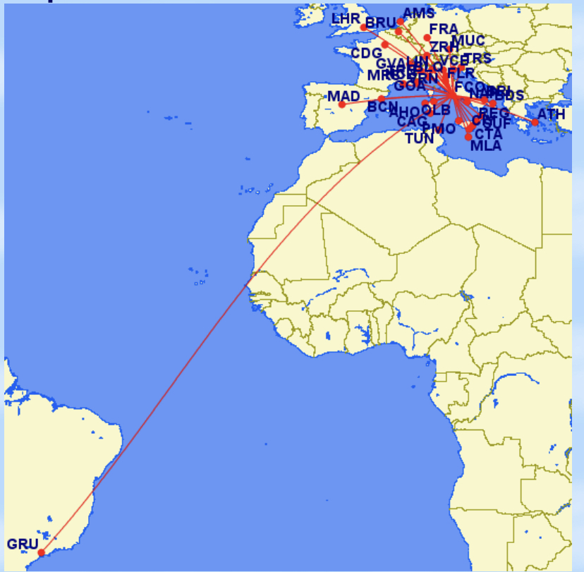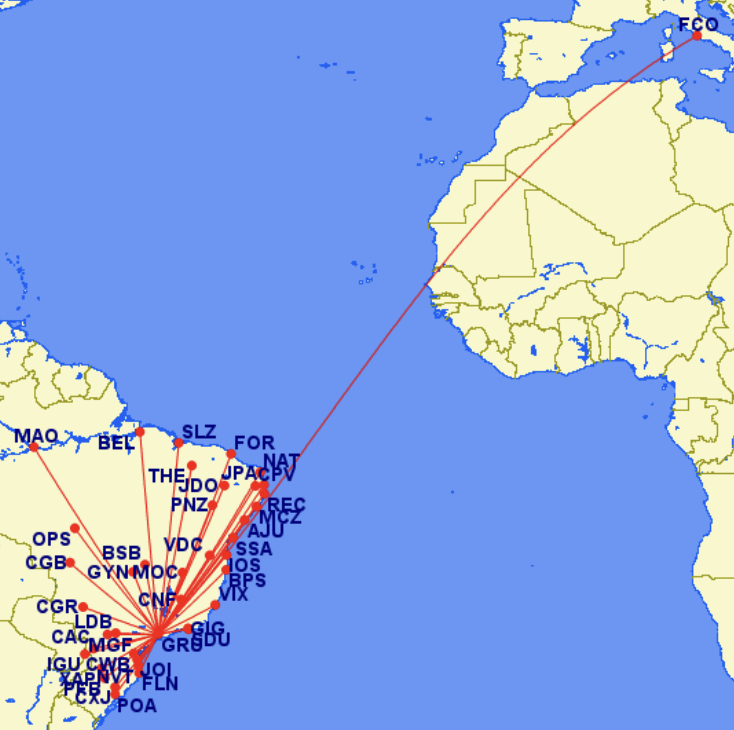 All’opposto, Alitalia può far viaggiare passeggeri dal suo network verso quello di GOL e AZUL via Roma Fiumicino e San Paolo con voli nazionali da: