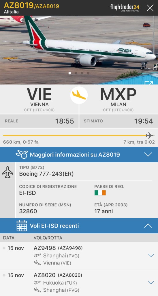 L’aereo #Boeing777-243ER EI-ISD #Alitalia e’ in atterraggio ora a #Milano #Malpensa proveniente da Vienna in #ferryflight. In precedenza ha operato un #volo per #AlitaliaCargo da #Shanghai per #Vienna come #AZ9498.