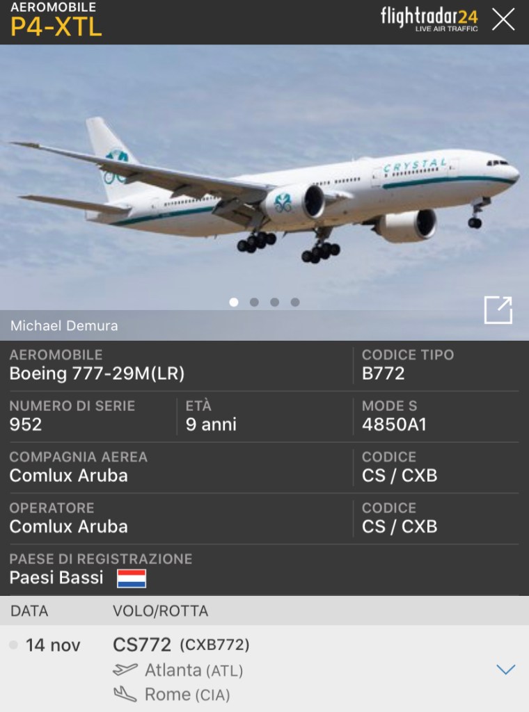 aeroporti, compagnie aeree Comlux Aruba: il B777/200LR VIP Crystal a Roma Ciampino Pubblicato da Italiavola il 15 novembre 2020 Questa mattina alle 10:30 spaccate, e’ arrivato a Roma Ciampino proveniente da Atlanta, il Boeing 777-29M LR P4-XTL della Comlux Aruba. L’aereo e’ un executive corporate jet tra i più esclusivi. Condividi: Fai clic per condividere su Facebook (Si apre in una nuova finestra) Facebook Fai clic qui per condividere su LinkedIn (Si apre in una nuova finestra) LinkedIn Fai clic qui per condividere su Reddit (Si apre in una nuova finestra) Reddit Fai clic qui per condividere su Pinterest (Si apre in una nuova finestra) Pinterest Fai clic qui per condividere su Tumblr (Si apre in una nuova finestra) Tumblr Fai clic per condividere su X (Si apre in una nuova finestra) X Mi piace Caricamento... Correlati