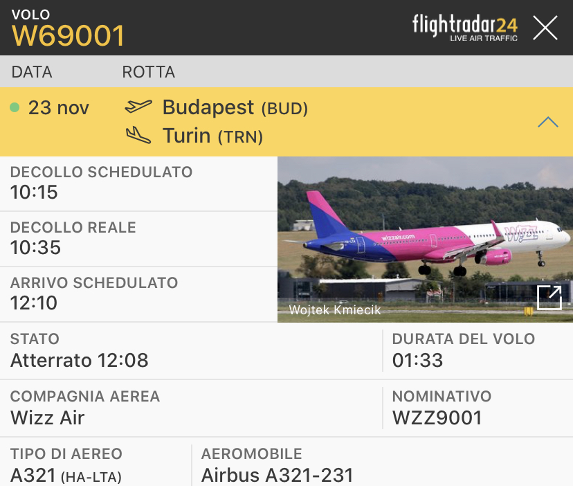 compagnie aeree Wizz arriva a Torino da Budapest con A321. A bordo il Ferencvaros Pubblicato da Italiavola il 23 novembre 2020 Quest’oggi alle 12:08 proveniente da #Budapest un A321-231 HA-LTA della #Wizz ha trasportato il #Ferencvaros che domani sera giocherà a #Torino con la #Juventus. Condividi: Fai clic per condividere su Facebook (Si apre in una nuova finestra) Facebook Fai clic qui per condividere su LinkedIn (Si apre in una nuova finestra) LinkedIn Fai clic qui per condividere su Reddit (Si apre in una nuova finestra) Reddit Fai clic qui per condividere su Pinterest (Si apre in una nuova finestra) Pinterest Fai clic qui per condividere su Tumblr (Si apre in una nuova finestra) Tumblr Fai clic per condividere su X (Si apre in una nuova finestra) X Mi piace Caricamento... Correlati