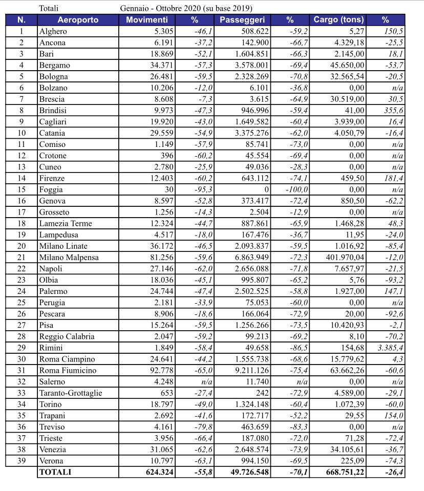 Ieri Assaeroporti ha rilasciato sul suo sito internet le statistiche relative al mese di ottobre 2020.