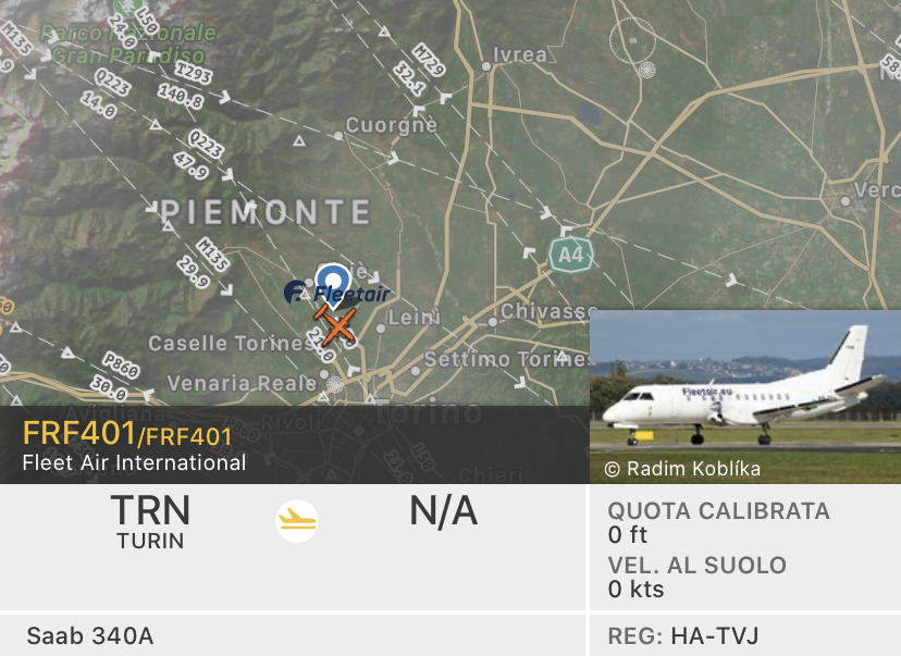 E’ arrivato a Torino proveniente da Malmö questo Saab340A della Fleet Air International. L’aereo e’ di nuovo da poco partito.