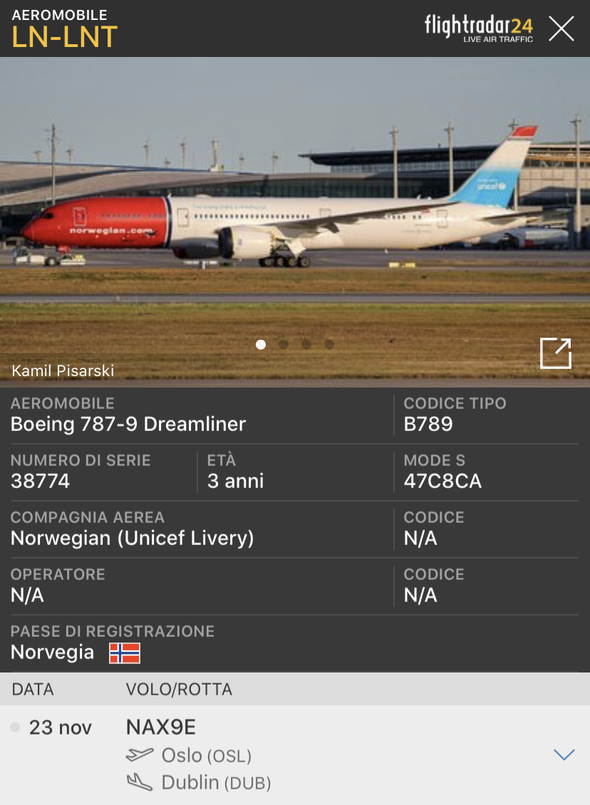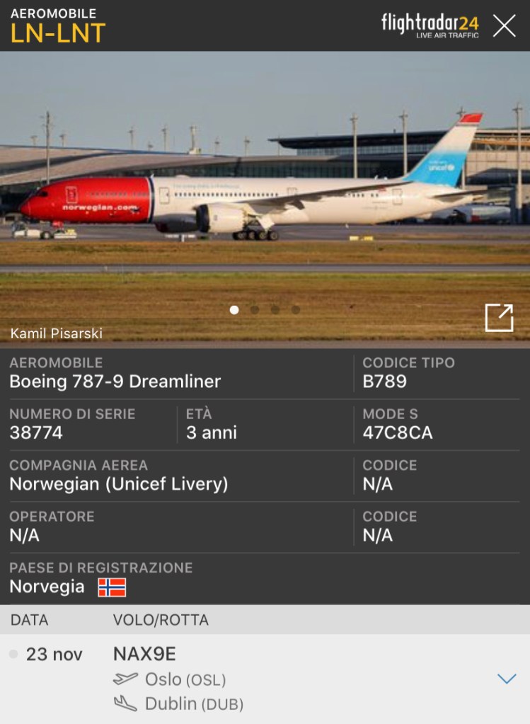 L’Unicef livery, il Boeing 787-9 #Norwegian LN-LNT ieri si e’ trasferito da #Oslo a #Dublino. E’ il secondo aereo che #Neos ha acquisito in leasing da #AerCap. Il velivolo ha utilizzato il call sign del vettore come NAX9E. L’altro aeromobile e’ ancora a Dublino per le attività previste prima della presa in carico da parte di Neos.
