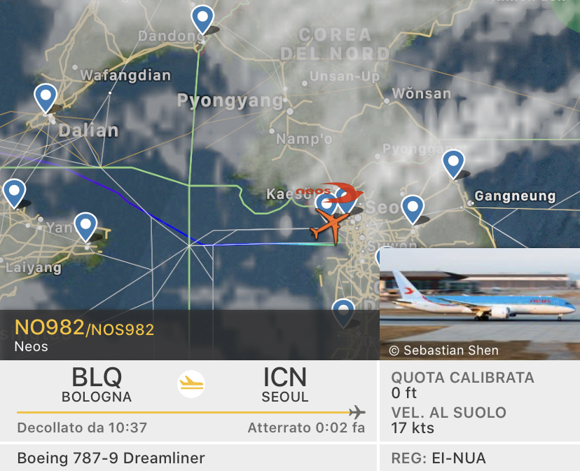 Il volo NO982 della Neos e’ da pochi minuti atterrato a Seoul. L’aereo, un B787-9 EI-NUA e’ decollato da Bologna.