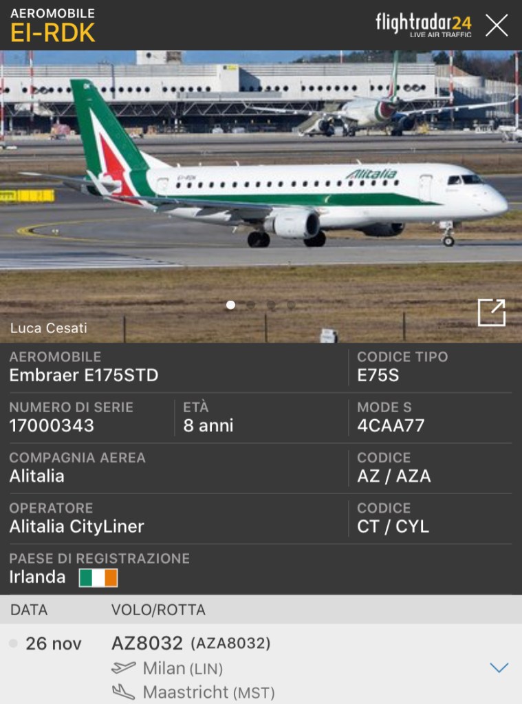 Oggi altri due E175STD ex Alitalia CityLiner in AS hanno lasciato l’Italia, e sono quattro. La destinazione di entrambi e’ stata Maastricht. Uno era a Milano Linate, quello registrato EI-RDK come AZ8032, invece EI-RDM come AZ8034 era proveniente da Roma Fiumicino. Entrambi da tempo erano già privi di titoli e parte della colorazione in coda. Gli aerei sono quelli accantonati in primavera perché pare che i lessor non avevano accettato la formula pay by the hour. Gli aerei hanno 8 anni di vita. Se il mercato deciderà che avranno un futuro, forse troveranno un nuovo operatore. Altrimenti si metteranno in fila per il Part out & scrap. Un altro aereo con le marche EI-RDJ, nei giorni scorsi aveva raggiunto Maastricht. Un altro, EI-RDA, il 2 luglio da Milano Linate aveva raggiunto Katowice. Erano parte dell’ordine da 20 aerei di cui 5 E190 acquisiti nel periodo Alitalia CAI.