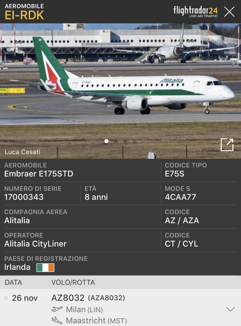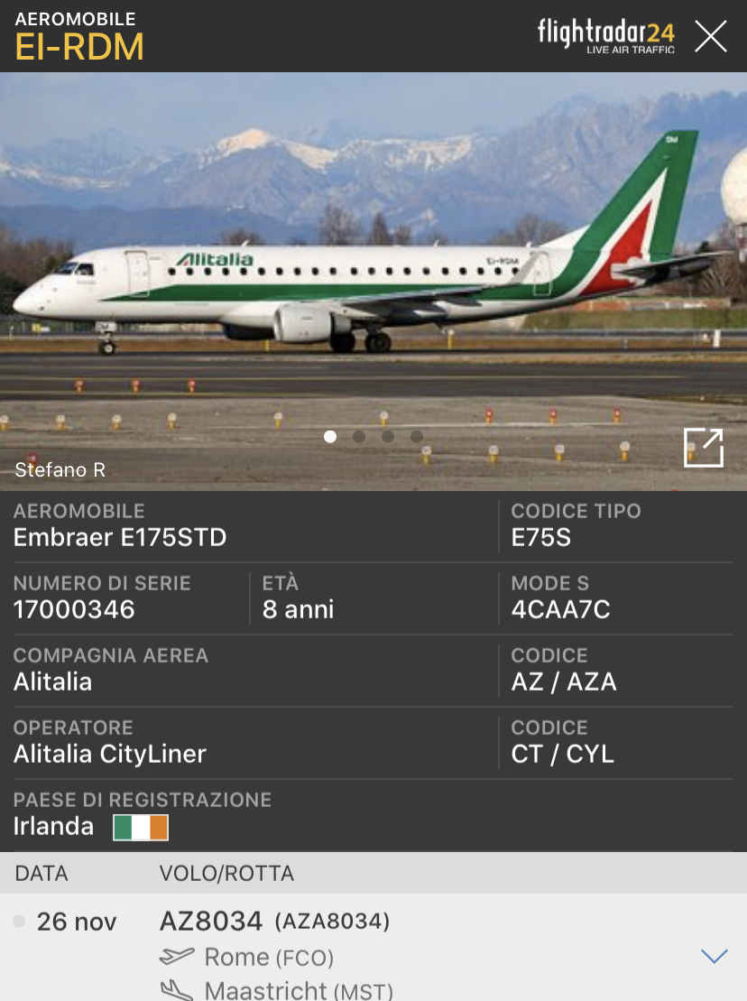 Oggi altri due E175STD ex Alitalia CityLiner in AS hanno lasciato l’Italia, e sono quattro. La destinazione di entrambi e’ stata Maastricht. Uno era a Milano Linate, quello registrato EI-RDK come AZ8032, invece EI-RDM come AZ8034 era proveniente da Roma Fiumicino. Entrambi da tempo erano già privi di titoli e parte della colorazione in coda. Gli aerei sono quelli accantonati in primavera perché pare che i lessor non avevano accettato la formula pay by the hour. Gli aerei hanno 8 anni di vita. Se il mercato deciderà che avranno un futuro, forse troveranno un nuovo operatore. Altrimenti si metteranno in fila per il Part out & scrap. Un altro aereo con le marche EI-RDJ, nei giorni scorsi aveva raggiunto Maastricht. Un altro, EI-RDA, il 2 luglio da Milano Linate aveva raggiunto Katowice. Erano parte dell’ordine da 20 aerei di cui 5 E190 acquisiti nel periodo Alitalia CAI.