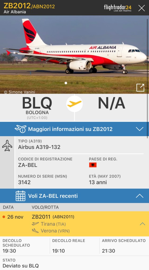 compagnie aeree Verona : Air Albania causa nebbia il volo e’ stato deviato a Bologna Pubblicato da Italiavola il 26 novembre 2020 Questa sera il volo ZB2011 Tirana-Verona della Air Albania e’ stato deviato all’alternato di Bologna a causa della bassa visibilita sull’aeroporto Veneto. Il volo era operato con A319-122 ZA-BEL. Condividi: Fai clic per condividere su Facebook (Si apre in una nuova finestra) Facebook Fai clic qui per condividere su LinkedIn (Si apre in una nuova finestra) LinkedIn Fai clic qui per condividere su Reddit (Si apre in una nuova finestra) Reddit Fai clic qui per condividere su Pinterest (Si apre in una nuova finestra) Pinterest Fai clic qui per condividere su Tumblr (Si apre in una nuova finestra) Tumblr Fai clic per condividere su X (Si apre in una nuova finestra) X Mi piace Caricamento... Correlati