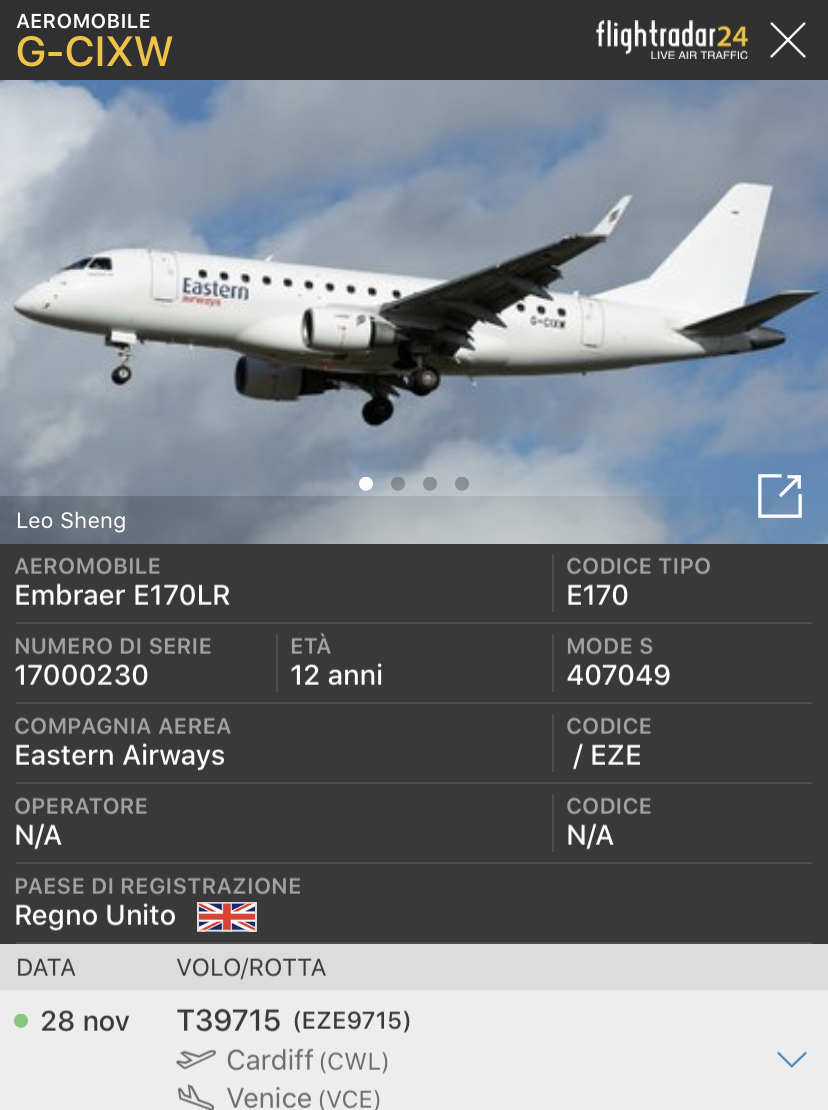 compagnie aeree Eastern Airways da Cardiff a Venezia Pubblicato da Italiavola il 28 novembre 2020 Questa sera alle 18:01 a Venezia e’ giunto questo Embraer E170LR proveniente da Cardiff. L’aereo della Eastern Airways ha la immatricolazione G-CIXS. Condividi: Fai clic per condividere su Facebook (Si apre in una nuova finestra) Facebook Fai clic qui per condividere su LinkedIn (Si apre in una nuova finestra) LinkedIn Fai clic qui per condividere su Reddit (Si apre in una nuova finestra) Reddit Fai clic qui per condividere su Pinterest (Si apre in una nuova finestra) Pinterest Fai clic qui per condividere su Tumblr (Si apre in una nuova finestra) Tumblr Fai clic per condividere su X (Si apre in una nuova finestra) X Mi piace Caricamento... Correlati