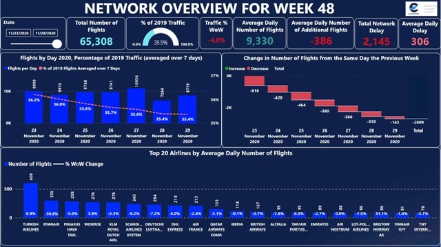 Lentamente il traffico aereo in Europa scivola sempre più in basso. Sebbene che siamo alla fine di novembre, in cielo le scie sono veramente rare. E’ questo l’emblematico segnale di una situazione molto critica. Infatti, nella settimana nr.48, stando ai dati di Eurocontrol siamo passati dal 36,2% di lunedì al 35,4% di sabato e domenica. Chi aiuta sui numeri e’ il traffico dei voli cargo, sempre in salita a dispetto di quelli passeggeri, ancor più in basso nei movimenti. Ma sono tragici i numeri del trasportato, molte aerolinee oltre a tagliare le frequenze, c’è’ stato pure il cambio degli aerei verso quelli con meno capacità di posti disponibili a bordo. Facilmente si assiste che dall’Aidbus 320 o 319 si passa si vari CRJ700 o 900, oppure Embraer E190 o E170/175.