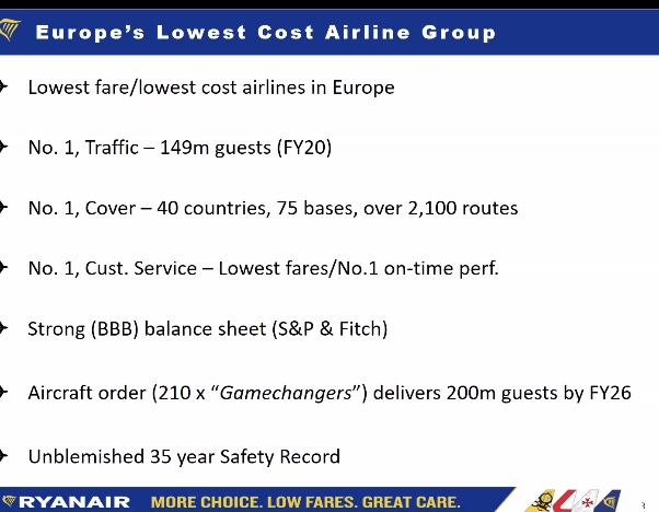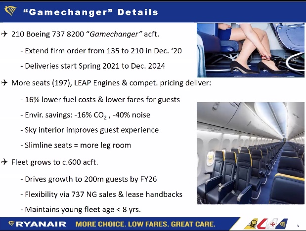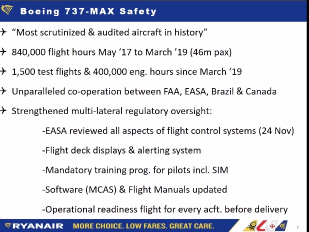 Nelle slides commentate da Michael O’Leary – CEO Ryanair, tra l’aplomb della giornata, ma sempre pronto a essere un guascone all’occorrenza. Per la compagnia aerea irlandese era il giorno, che ha permesso a Boeing di tirare un sospiro di sollievo, dopo la fila di cancellazioni dei B737MAX, anzi B737 family come lo chiama ora Dave Calhoun – CEO The Boeing Company – , nei suoi 20 mesi passati a terra.