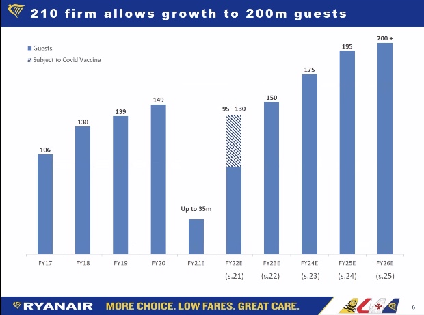 Nel 2022, Ryanair prevede di arrivare a 150 milioni, almeno tre esercizi dopo le cifre ante-covid. Poi 175 milioni nel 2023, 195 nel 2024 e oltre 200 milioni nel 2025.