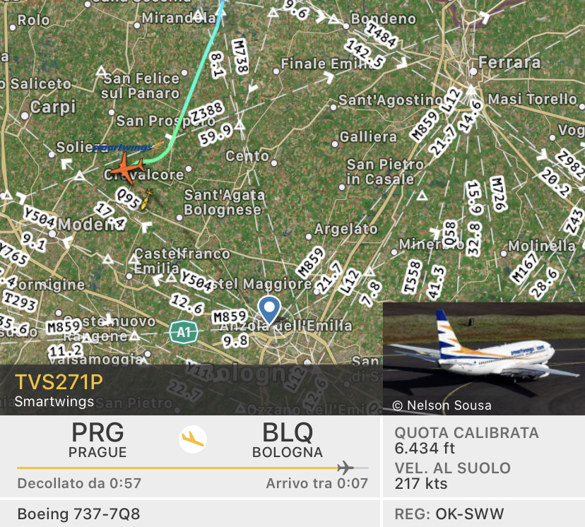 Un volo charter da Bologna per Copenaghen sarà operato da questo Boeing 737/7Q8 della Smartwings, che a breve atterrerà sulla pista dello scalo bolognese.