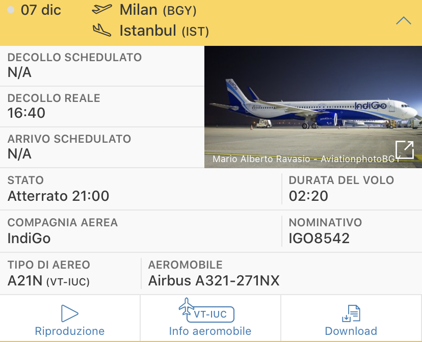 compagnie aeree IndiGo e SpiceJet a Bergamo Pubblicato da Italiavola il 8 dicembre 2020 Ieri e’ partito per Delhi questo A321-271NX VT-IUC della IndiGo per Istanbul – Delhi. Nella serata di domani arriverà un A321/200 della HiFly da Amritsar via Tbilisi. L’aereo vola per conto della SpiceJet. Condividi: Fai clic per condividere su Facebook (Si apre in una nuova finestra) Facebook Fai clic qui per condividere su LinkedIn (Si apre in una nuova finestra) LinkedIn Fai clic qui per condividere su Reddit (Si apre in una nuova finestra) Reddit Fai clic qui per condividere su Pinterest (Si apre in una nuova finestra) Pinterest Fai clic qui per condividere su Tumblr (Si apre in una nuova finestra) Tumblr Fai clic per condividere su X (Si apre in una nuova finestra) X Mi piace Caricamento... Correlati