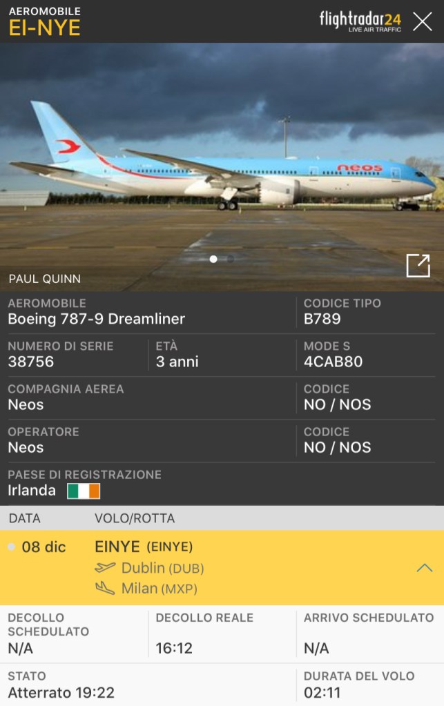 Poco più di mezz’ora fa e’ atterrato a Milano Malpensa il quinto Boeing 787-9 Neos EI-NYE. E’ decollato da Dublino alle 16:12 ed e’ giunto a Malpensa 2 ore e 10 minuti dopo. L’aereo precedentemente aveva le marche LN-LNX.