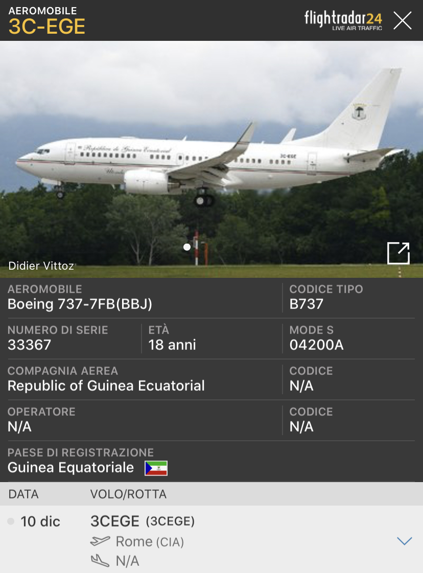 compagnie aeree Roma : transitato il B737/700BBJ della Repubblica della Guinea Equatoriale Pubblicato da Italiavola il 10 dicembre 2020 Quest’oggi e’ arrivato alle 12:53 il Boeing 737/700BBJ 3C-EGE della Repubblica della Guinea Equateriale. Questa sera l’aereo e’ ripartito con destinazione di nuovo Malabo. Grazie a un lettore che ci ha segnalato la partenza dell’aereo da Ciampino. Condividi: Fai clic per condividere su Facebook (Si apre in una nuova finestra) Facebook Fai clic qui per condividere su LinkedIn (Si apre in una nuova finestra) LinkedIn Fai clic qui per condividere su Reddit (Si apre in una nuova finestra) Reddit Fai clic qui per condividere su Pinterest (Si apre in una nuova finestra) Pinterest Fai clic qui per condividere su Tumblr (Si apre in una nuova finestra) Tumblr Fai clic per condividere su X (Si apre in una nuova finestra) X Mi piace Caricamento... Correlati