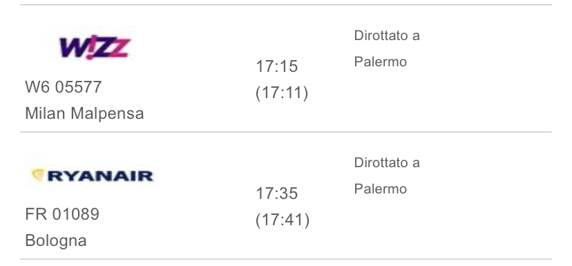 Due i voli atterrati a Palermo nel pomeriggio e con originaria destinazione Catania.