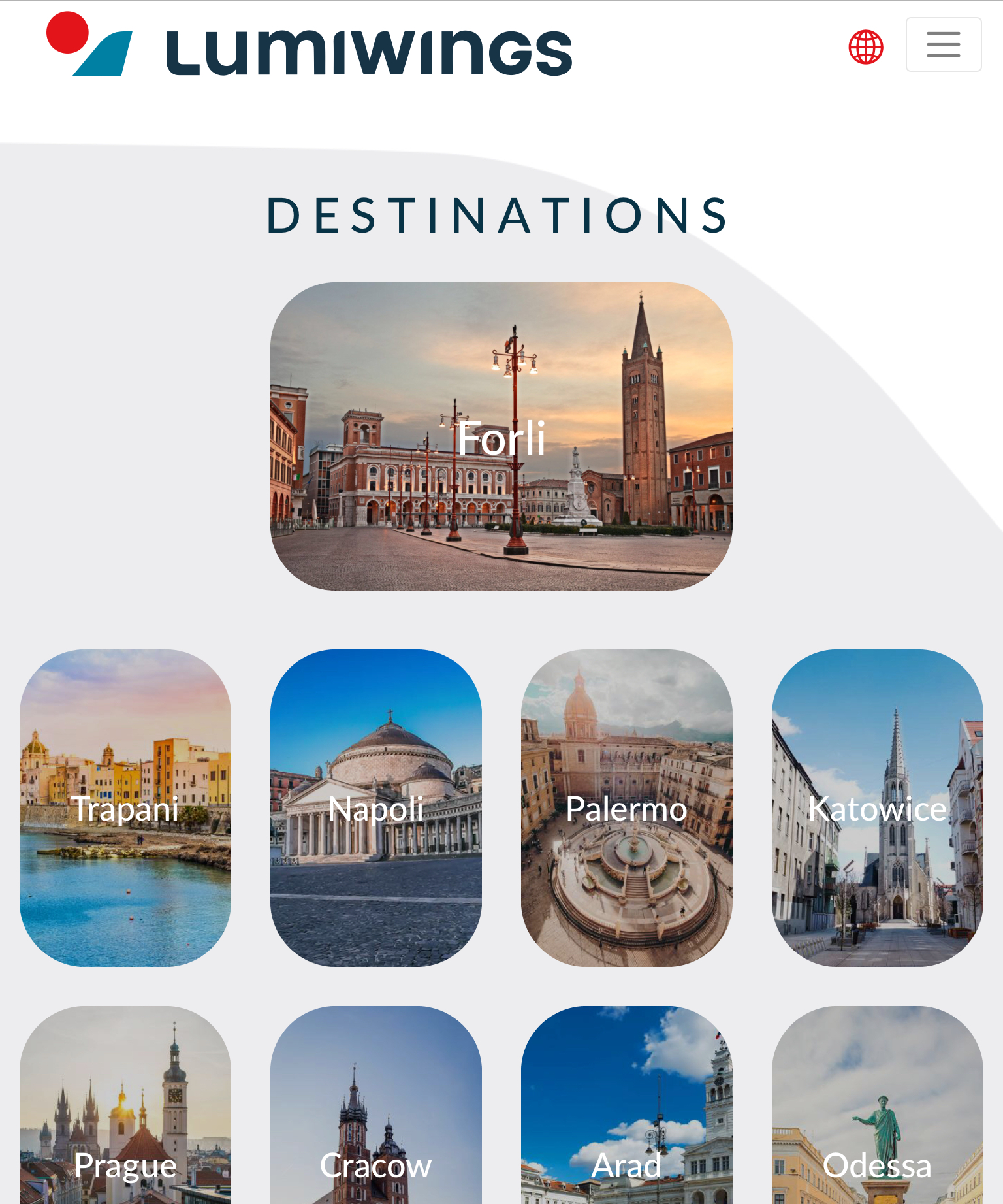 Tredici e non più nove saranno le destinazioni del bouquet preparato per Forli da Lumiwings. Ora si aggiungono: Palermo, Katowice, Cefalonia e Santorini. Le altre sono Napoli, Trapani, Arad, Cracovia, Praga, Rodi, Heraklion, Corfu e Odessa. Queste aggiunte sono comparse stamani sulla homepage del sito del vettore http://www.lumiwings.com