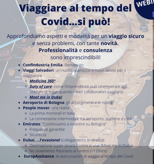 Il secondo appuntamento e’ stato un webinar “viaggiare al tempo di covid…si può” in collaborazione con Confindustria Emilia e Viaggi Salvadori. Tra i punti di spicco “People mover. Una realtà”. I topic toccati: