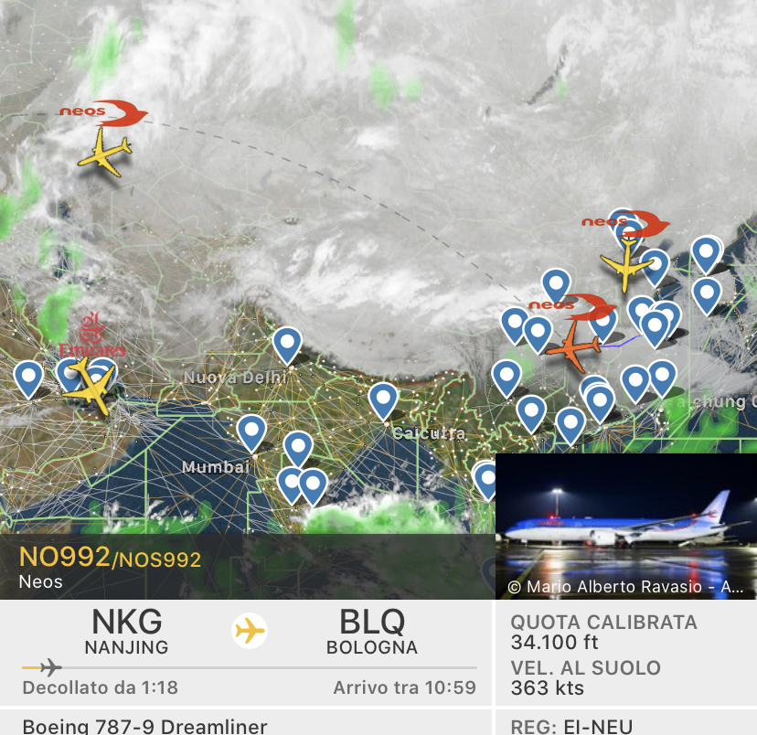 Qui in questo screenshot di ieri sera, vediamo tre aerei Boeing 787-9 della flotta Neos impegnati tra la Cina e Bologna o viceversa. E’ una spola quasi continua, che tocca anche Milano Malpensa in origine da vari punti di partenza.