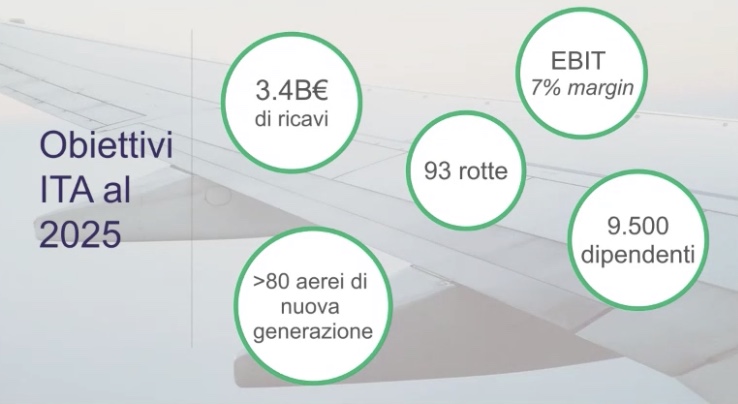 Le parole sostenibilità, flessibilità, adattabilità sono ricorse molte volte nella presentazione dello schema del piano industriale di ITA – Italia Trasporto Aereo avvenuta questo pomeriggio e da poco terminata alla quale abbiamo avuto accesso online. Gli obiettivi e i presupposti sono ambiziosi. EBITDAR da raggiungersi positivamente nel 2022 e EBIT l’anno dopo. 52 aerei al lancio di cui 9 sul lungo raggio. 86 nel 2022 e 110 nel 2025. Il tutto fatto con mosse prese e decise al momento in corso d’opera. Il piano non sarà ingessato e di roccia. Ma bensì facilmente può essere smussato e cambiato. Il tutto nell’ottica di non perdere soldi. Si parte con 5200-5500 persone per arrivare a 9500 nel 2025. Posizionamento per il business travel e premium leisure. Decollo tra aprile e giugno 2021. Il tutto dipenderà dalle approvazioni governative e della EU