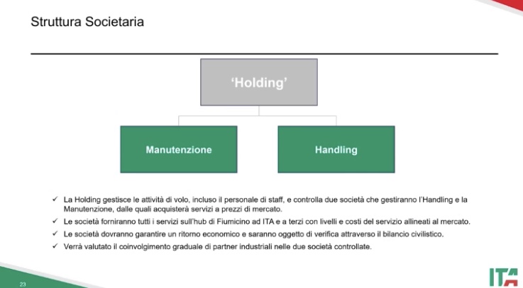Oltre alla holding. vi sarà una società di Handling per i propri servizi e per terzi. Stessa cosa una società di maintenance con gli stessi orientamenti. Sia per propria necessità di seguire la flotta e per fare business in compito internazionale.