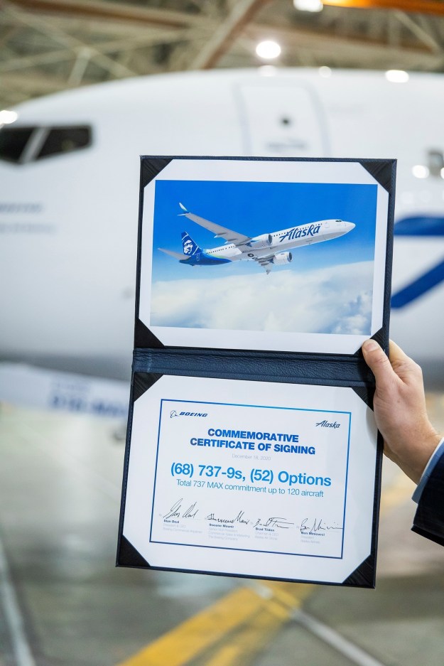 Nella foto il certificato commemorativo della firma dell’accordo avvenuto il 18 dicembre tra Alaska Airlines e Boeing per l’ordine 737-9 MAX.