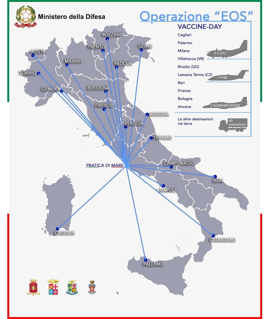Dopodomani parte l’Operazione EOS. Cioè’ il Vaccine Day. Inizierà la movimentazione dall’hub di Pratica di Mare verso i subhub. Una parte voleranno con una componente aerea della Difesa, inizialmente di 5 aerei (2 C27J AM, 2 Do228 EI e 1 P180 MM) per poi salire a 11, insieme a 73 elicotteri.