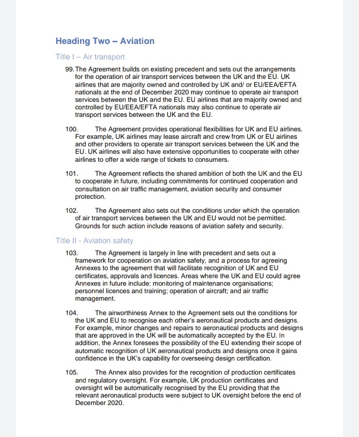 Nell’immagine, ci sono i quattro punti riguardanti il trasporto aereo, come dell’accordo in via di firma tra Regno Unito e EU per la Brexit.