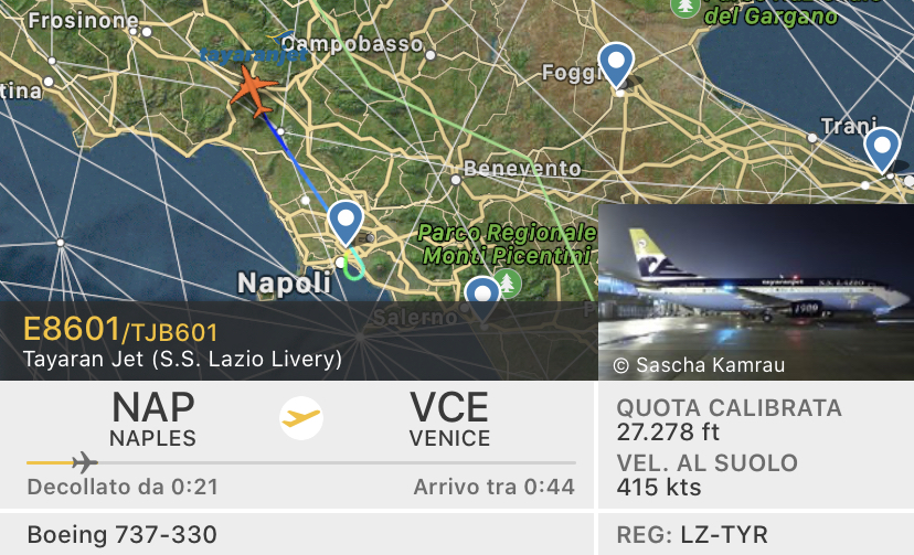 E’ appena decollato da Napoli il B737/330 LZ-TYR della Tayaranjet con a bordo la Salernitana. Il volo e’ diretto a Venezia dove domani il team campano giocherà con la squadra di calcio della città lagunare.