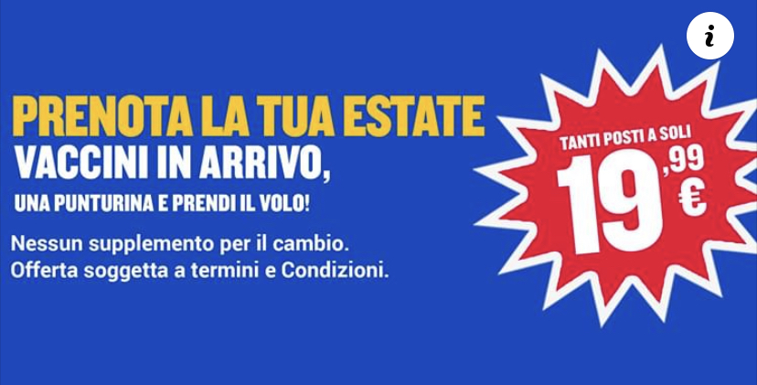 Ryanair e’ market sensitive, sempre sul pezzo. Eccone una dimostrazione. Domani partono i vaccini e perché non lanciare un offerta, prendendo la palla al balzo.