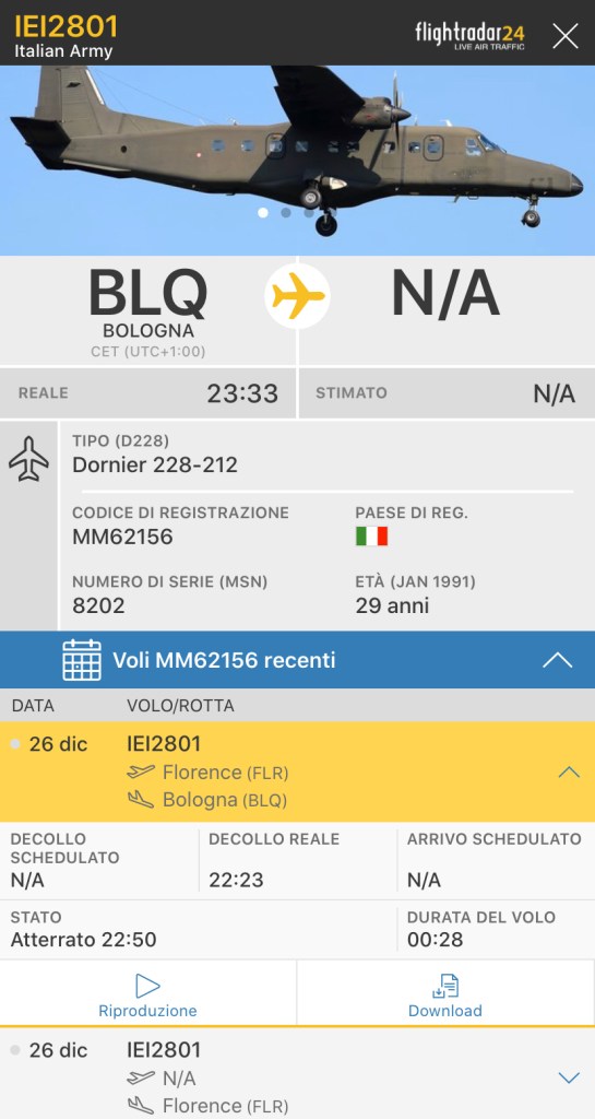 Alle 21:58 il Dornier 228 dell’Esercito Italiano e’ arrivato a Firenze dove ha scaricato le dosi di vaccino Pfizer-Biontech destinate alla Toscana. Il prezioso carico e’ stato imbarcato a Pratica di Mare. Poi alle 22:23 e’ decollato per Bologna dove e’ atterrato alle 22:50. Quindi alle 23:33 e’ partito per Ancona. A seguire l’aereo ritornerà all’aeroporto di partenza.