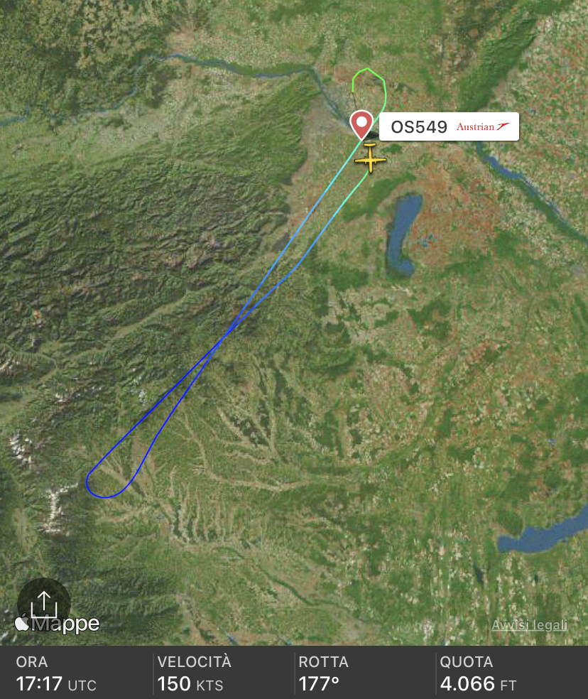 Questa sera il volo OS549 da Vienna a Bologna a metà strada e’ ritornato indietro all’aeroporto di partenza. Il DHC8Q400 OE-LGL della Austrian Airlines ha fermato la salita a FL240 e dopo un po’ ha invertito la rotta.