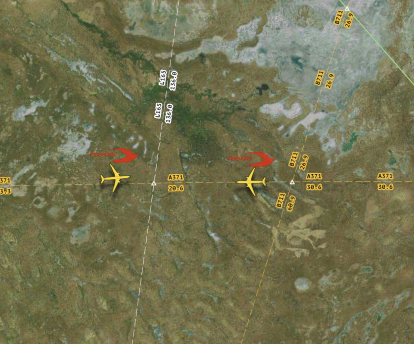 E’ singolare questa immagine che ritrae due Boeing 787-9 della Neos in volo su una rotta praticamente convergente con soli 1000 piedi di separazione.