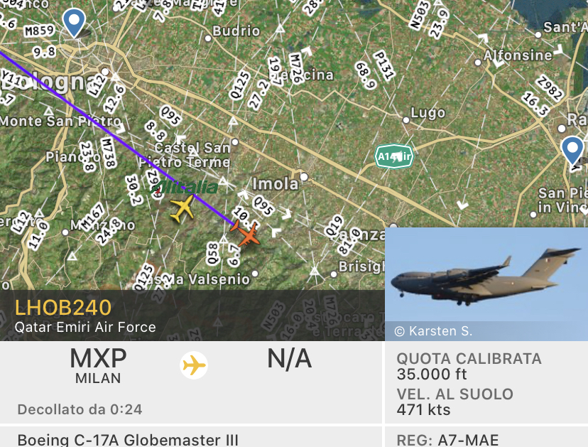 L’aereo con le marche A7-MAE e il numero di volo LHOB243 e’ poi ripartito una mezzoretta fa e ora sta sorvolando l’Emilia Romagna verso est.