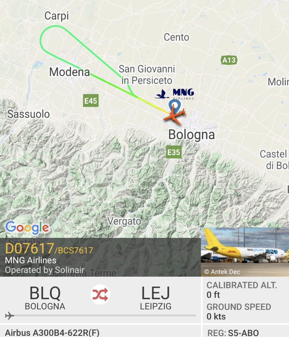 Decolla e riatterra in pochi minuti. E’ salito fino a quasi 6000ft e poi ha virato a sinistra e velocemente si e’ stabilizzato atterrando a Bologna. E’ stato il volo BCS7617, l’A300 S5-ABO della MNG Cargo, che vola per DHL. L’aereo era diretto all’hub di Lipsia.