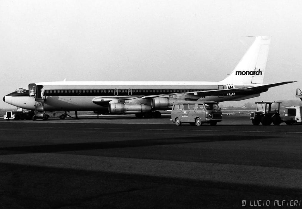 E’ il meno conosciuto, qualche giorno fa abbiamo pubblicato la foto di un Boeing 720 della Conair of Scandinavia. Qui c’è’ quello della inglese Monarch. I due aerei sono “fratelli”, anche questo e’ un Boeing 720-051B, le marche G-AZNX. La foto in bianco e nero di Lucio Alfieri lo riprende a Bologna e’ del 26/11/1976. Il velivolo volava da e per Londra Luton.