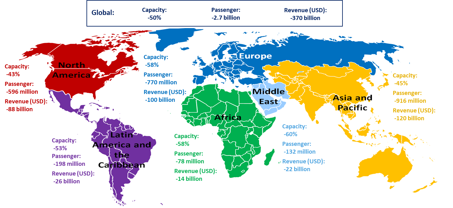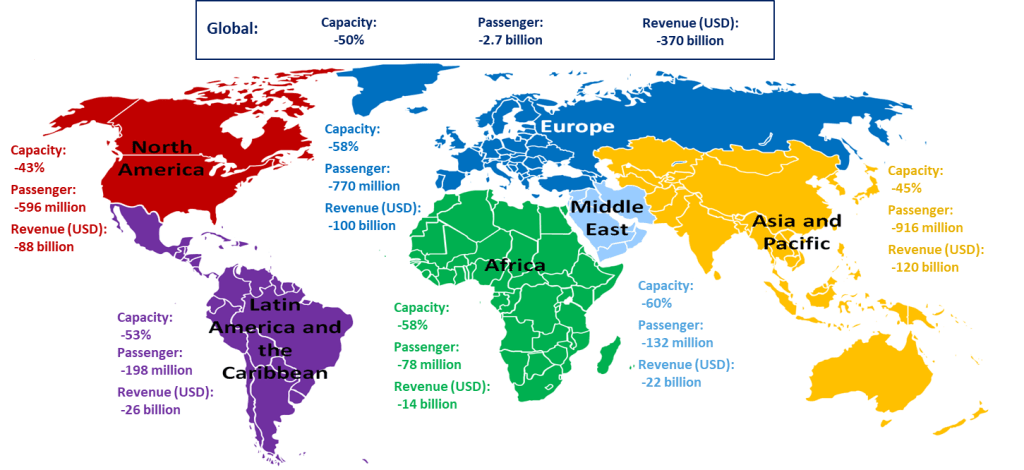 Il calo globale di 370 miliardi di dollari nei ricavi operativi lordi dei passeggeri delle compagnie aeree ha rappresentato perdite di 120 miliardi in Asia / Pacifico, 100 miliardi in Europa e 88 miliardi in Nord America, seguiti da 26 miliardi, 22 miliardi e 14 miliardi in America Latina e Rispettivamente Caraibi, Medio Oriente e Africa.