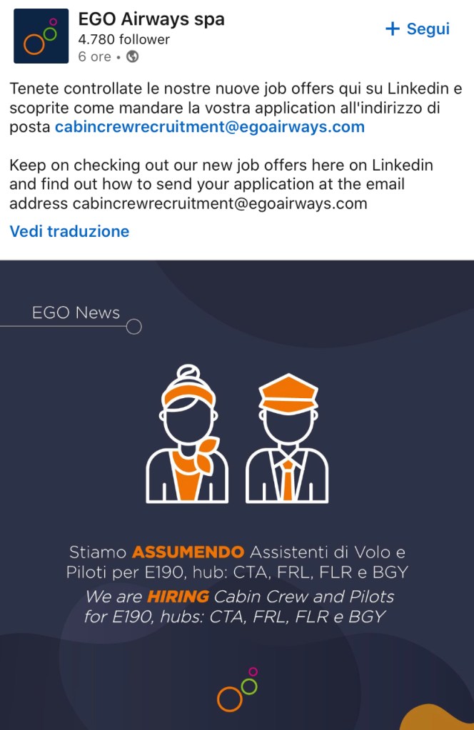 Nello stiloso post pubblicato su #LinkedIn da parte di #EgoAirways, la nuova compagnia italiana cerca anche #piloti, oltre agli #assistentidivolo.