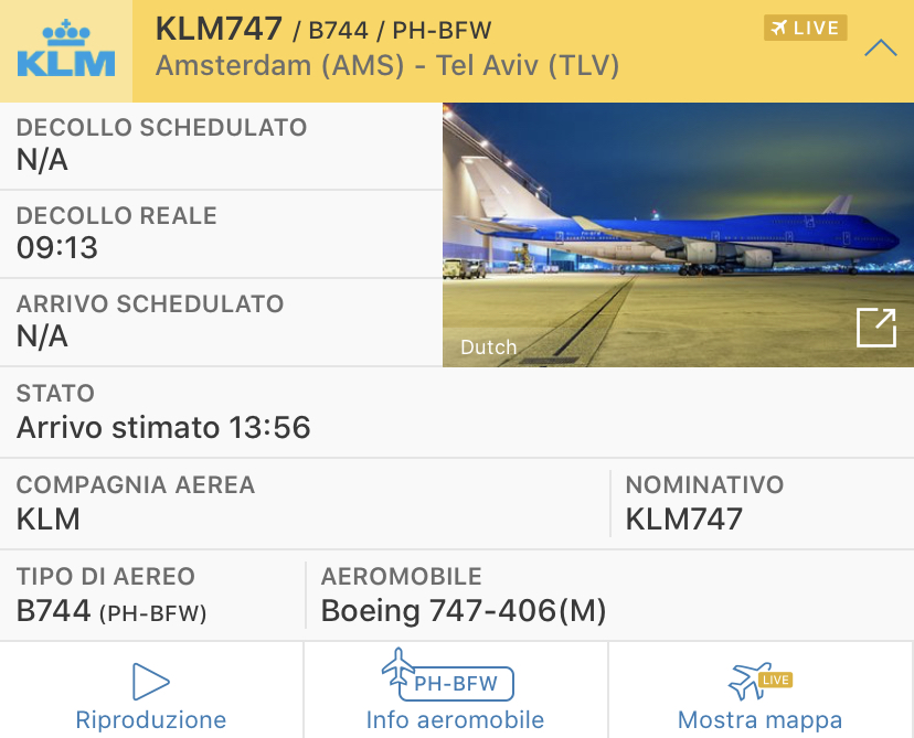 L’aereo visibile ora su Flightradar24 come KLM747 sta volando da Amsterdam a Tel Aviv in Israele.