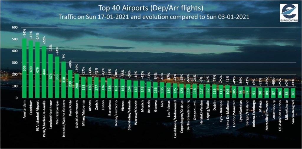 Alla stessa stregua di questo report di Eurocontrol, che elenca l’andamento dei movimenti registrati il 17 gennaio 2021 comparati con quelle di due settimane prima.